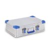 Aluminiumskasse - B:600mm D:400mm H:170mm - Volum på 28 Liter. Værsikker, IP54. Kapasitet 50 kg. Zarges Eurobox er beregnet for deg som vil ha en solid innpakning til en gunstig pris. Kassene er utstyrt med pakning i lokket som hindrer inntrengning av støv og vannsprut, forsterkningsprofiler i alle ender og rustfrie hengsler. I tillegg er kassene utstyrt med smarte stabelhjørner, fjærbelastede håndtak og solide haspelåser som enkelt låses med hengelås. Kassen har også markeringsskilt som kan byttes ut med en tilpasset nøkkellås. Kan utstyres med ulike typer tilpasset innredning som skillevegg, verktøybakker, verktøymapper, plukkskum, etc.