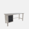 L:2000mm D:750mm H:750-1050mm. Enkelt bord med kraftig 40mm benkeplate med stålplate og underdel med 3 skuffer (90mm, 180mm og 270mm). Bordet har manuelt justerbare bein og høy kapasitet på 800 kg.