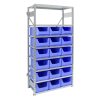 Dybde 500 mm - Komplett delelagerreol med 8 hyller og 18 stk stablebare plastbokser (Futura 2). Kapasitet: 160 kg/hylle.