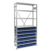 L:1050mm D:600mm H:2000mm - Komplett delelager med 10 hyller og totalt 32 plastskuffer i 2 størrelser: 16 skuffer DxBxH 600x240x95mm og 16 skuffer DxBxH 600x120x95mm. Kapasitet 160 kg pr hylle.