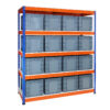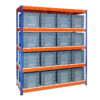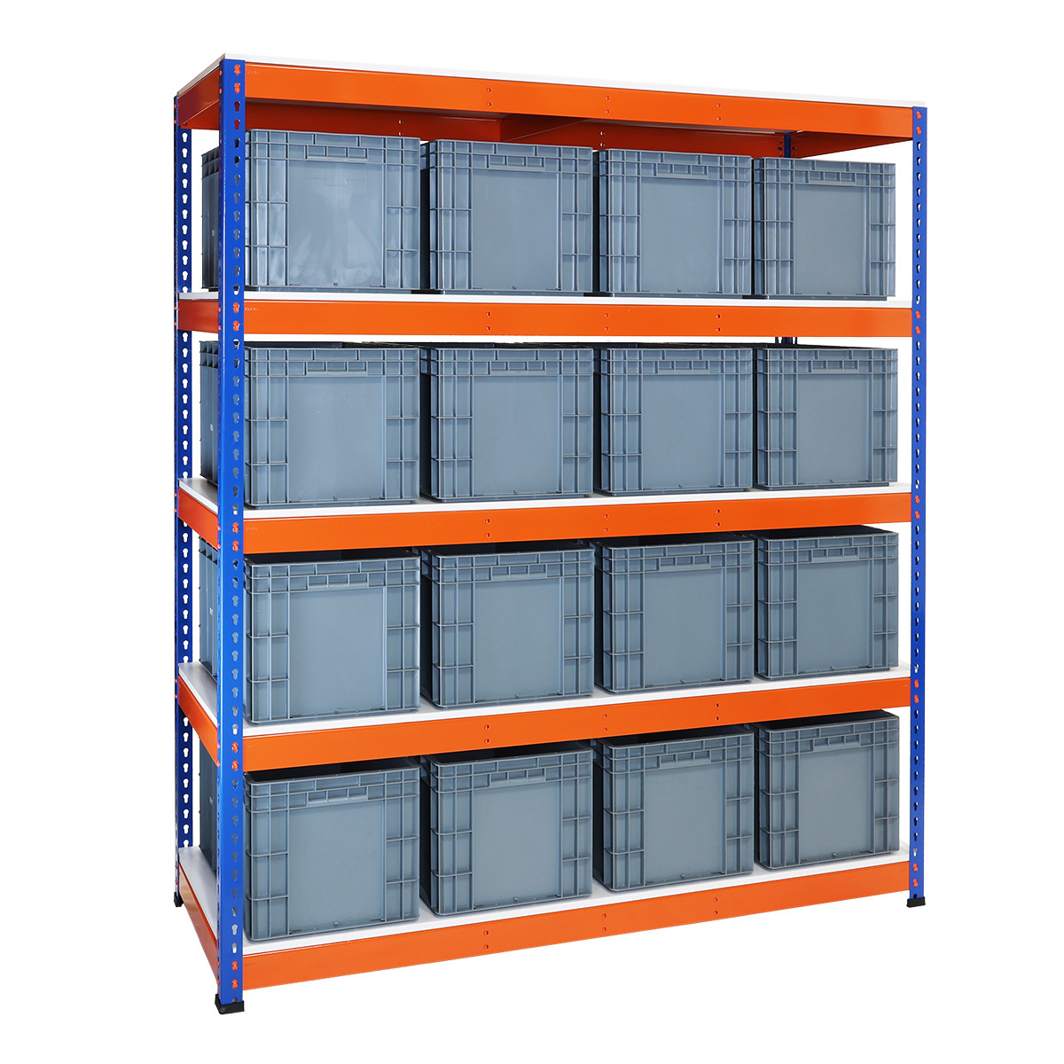 H:1981mm D:620mm L:1841mm. - Komplett kraftig multisystem med 16 stk Euroboks RYDD 70 Liter uten lokk (lokk kan kjøpes i tillegg). Lakkert med oransje på skinner og blå på stolper. Sterke hvite melaminplater (plastbelagte sponplater).Meget kraftig reol. Enkel montering uten skruer.