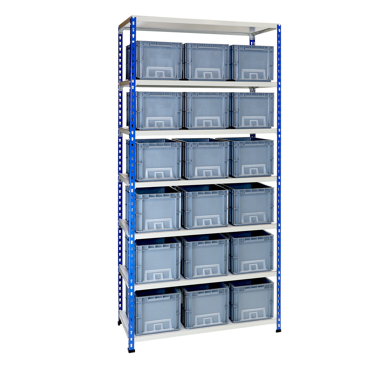 L:1030mm D:468mm H:1981mm - Komplett kraftig reol med 7hyller og 18 stk 20 liters Eurobokser uten lokk (lokk kan kjøpes i tillegg). Mål på boks: D:400mm B:300mm H:220mm. Kapasitet pr hylle er 275 kg. Enkel montering med kun bruk av monteringshammer (medfølger).