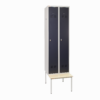 H:2180mm D:800mm L:600mm - Helsveist kvalitetsskap med 2 dører og sittebenk. Inkludert hasp for hengelås på alle dører og justeringsskrue i bein. Skapene har ventilasjonshull i dør, hylle med opphengsstang og 2 stk opphengskroker. Leveres i pulverlakkert utførelse med RAL 7035 på kabinett og RAL 7024 på skapdører.