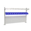 H:845mm B:1350mm - Passer verktøybenk på 1500mm. Inneholder 2 stk stolper med høyde på 845mm, 1 stk opphengsplate, en overhylle med dybde på 214mm som monteres rett eller skrå, en opphengsskinne for plastbokser og 12 stk plastbokser Futura 5. Plate. Hylle og Skinne har lengde på 1250mm. Opphengsplaten er perforert med hull på 9x9mm og med CC38mm.