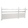 H:845mm B:1975mm - Passer verktøybenk på 2000mm. Inneholder 3 stk stolper med høyde på 845mm, 2 stk opphengsplate, 2 stk overhylle med dybde på 214mm som monteres rett eller skrå og 2 stk opphengsskinne for plastbokser. Plate, Hylle og Skinne har lengde på 1250mm og 625mm. Opphengsplaten er perforert med hull på 9x9mm og med CC38mm.