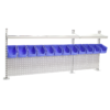 H:845mm B:1975mm - Passer verktøybenk på 2000mm. Inneholder 3 stk stolper med høyde på 845mm, 2 stk opphengsplate, 2 stk overhylle med dybde på 214mm som monteres rett eller skrå, 2 stk opphengsskinne for plastbokser og 12 stk plastboks Futura 4. Plate, Hylle og Skinne har lengde på 1250mm og 625mm. Opphengsplaten er perforert med hull på 9x9mm og med CC38mm.