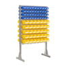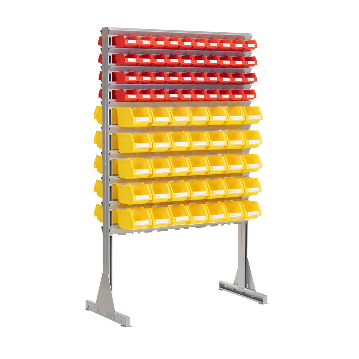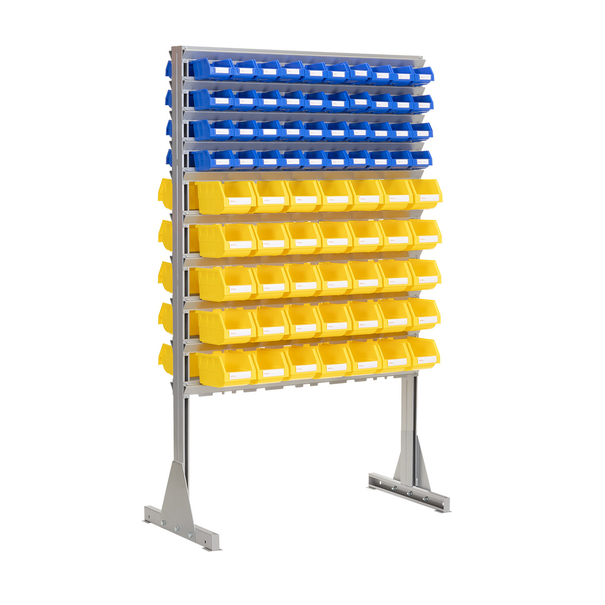 Komplett stativ med 150 plastbokser - B:1150mm H:1875mm D:510mm - Dette er et enkelt og kraftig plastboksstativ hvor boksene er hektet på stativet. Stativet er bygget opp med 56 stk solide plastbokser av type RYDD 014. Boksene kan enkelt hektes på og av stativet. Det medfølger 2 stk ekstra plastboks RYDD 014 og 16 stk ekstra plastboks RYDD 012.