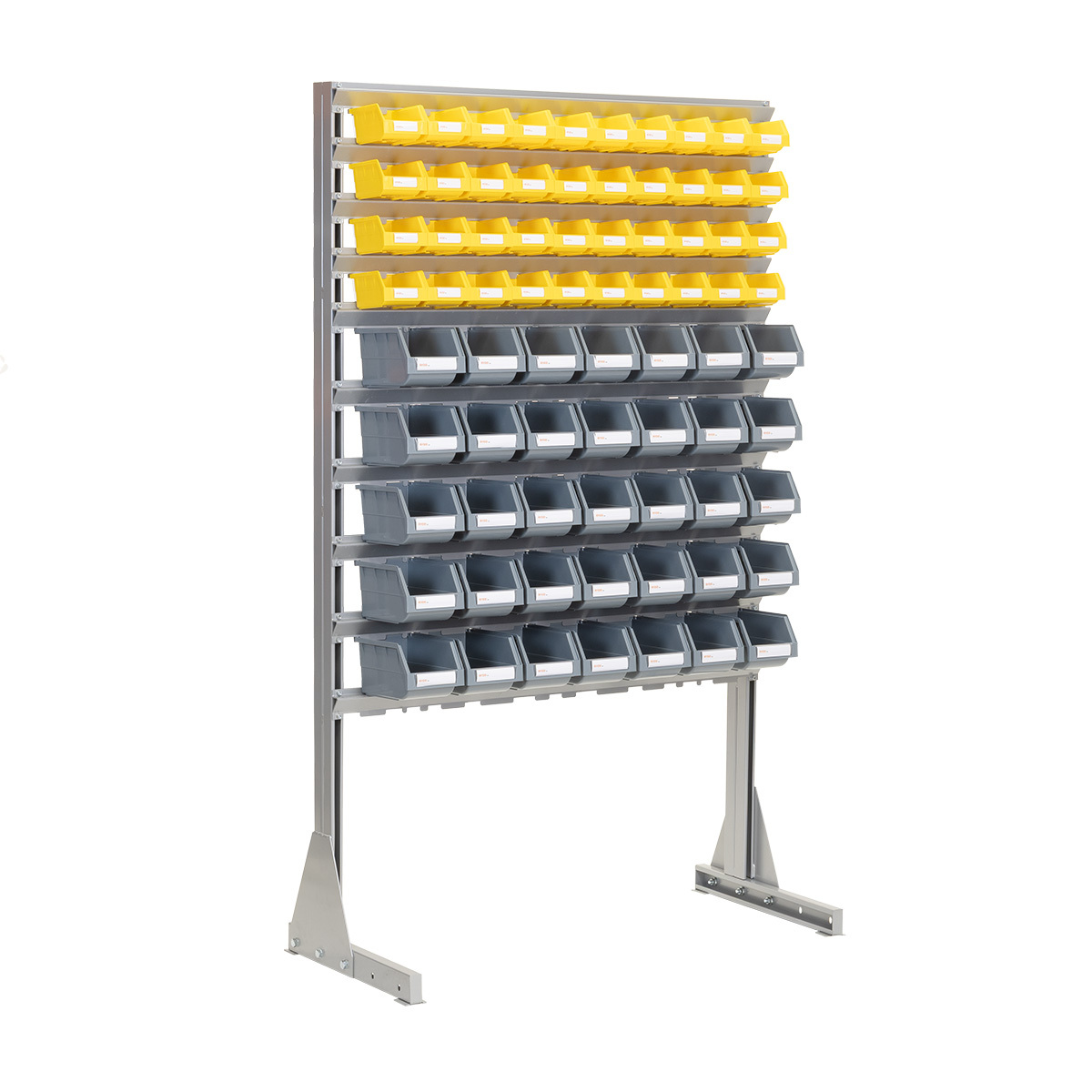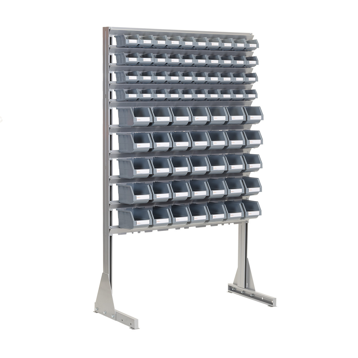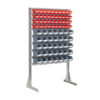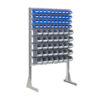 Komplett stativ med 75 plastbokser - B:1150mm H:1875mm D:510mm - Dette er et enkelt og kraftig plastboksstativ hvor boksene er hektet på stativet. Stativet er bygget opp med 56 stk solide plastbokser av type RYDD 014. Boksene kan enkelt hektes på og av stativet. Det medfølger 1 stk ekstra plastboks RYDD 014 og 8 stk ekstra plastboks RYDD 012.