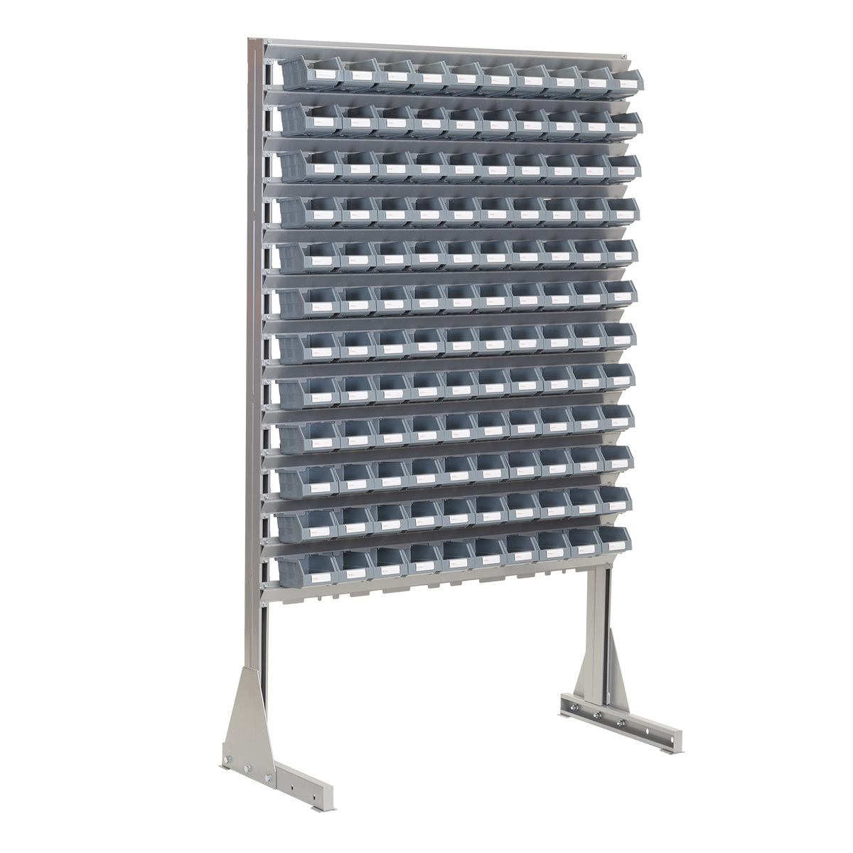 Komplett stativ med 120 plastbokser - B:1150mm H:1875mm D:510mm - Dette er et enkelt og kraftig plastboksstativ hvor boksene er hektet på stativet. Stativet er bygget opp med 120 stk solide plastbokser av type RYDD 014. Boksene kan enkelt hektes på og av stativet.