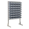 Komplett stativ med 56 plastbokser - B:1150mm H:1875mm D:510mm - Dette er et enkelt og kraftig plastboksstativ hvor boksene er hektet på stativet. Stativet er bygget opp med 56 stk solide plastbokser av type RYDD 014. Boksene kan enkelt hektes på og av stativet. Det medfølger 4 stk ekstra plastbokser RYDD 014.