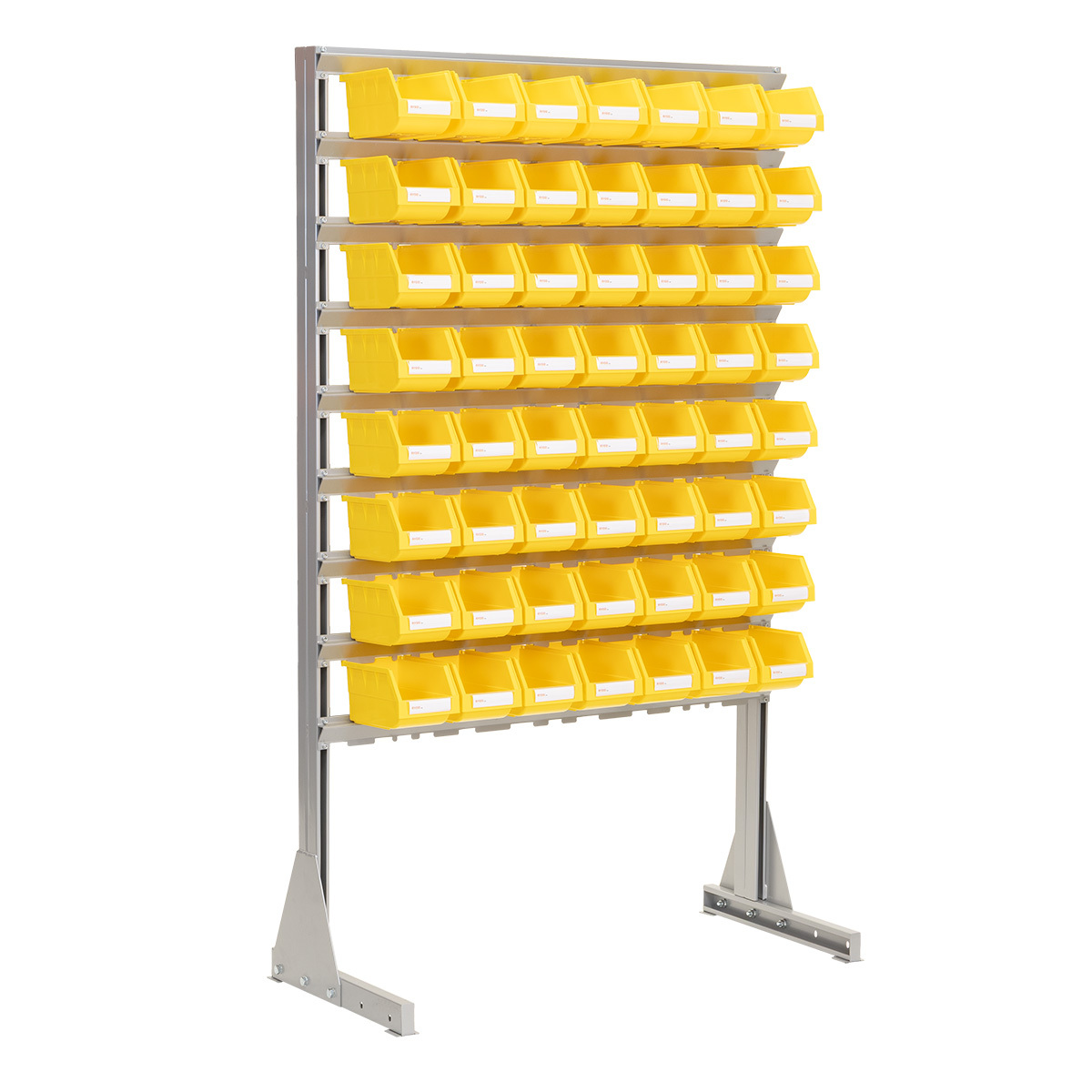 Komplett stativ med 56 plastbokser - B:1150mm H:1875mm D:510mm - Dette er et enkelt og kraftig plastboksstativ hvor boksene er hektet på stativet. Stativet er bygget opp med 56 stk solide plastbokser av type RYDD 014. Boksene kan enkelt hektes på og av stativet. Det medfølger 4 stk ekstra plastbokser RYDD 014.