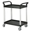 L:850mm B:480mm H:950mm - Tralle med 2 hyller i fiberglass/PP, ramme i aluminium. Hjul: Svingbare - 2 med lås. Vekt: 9 kg. Kapasitet på 120 kg pr hylle, max 250kg pr tralle.