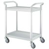 L:850mm B:480mm H:950mm - Tralle med 2 hyller i fiberglass/PP, ramme i aluminium. Hjul: Svingbare - 2 med lås. Vekt: 9 kg. Kapasitet på 120 kg pr hylle, max 250kg pr tralle.