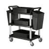 L:1100mm B:480mm H:1000mm - Tralle med 3 hyller i fiberglass/PP, ramme i aluminium. 2 plastbokser 240x350x470 mm og 3 plastbokser 550x390x180 mm. Hjul: Svingbare - 2 med lås. Vekt: 18 kg. Kapasitet på 120 kg pr hylle, max 250kg pr tralle.