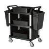 L:1100mm B:480mm H:1000mm - Tralle med 3 hyller i fiberglass/PP, 3 tette sider, ramme i aluminium. 2 plastbokser 240x350x470 mm og 3 plastbokser 550x390x180 mm. Hjul: Svingbare - 2 med lås. Vekt: 17 kg. Kapasitet på 120 kg pr hylle, max 250kg pr tralle.